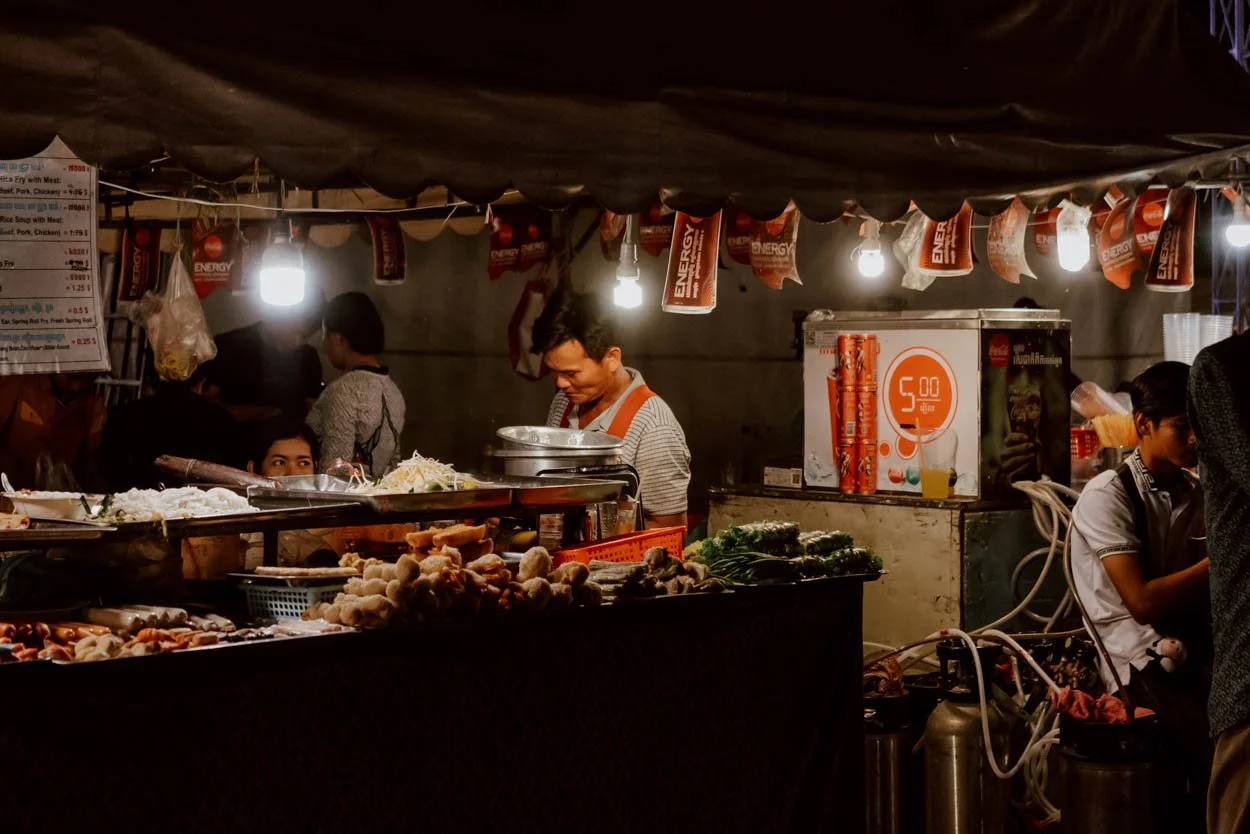 Although the riverside area of Phnom Penh wasn’t our favourite neighbourhood, dinner in the night market is a really lovely way to top off your second or third evening in the city. The deal is pretty straightforward - lots of lightbulb lit stalls offering up standard noodles, spring rolls, meat, and veg to more exotic fare, which you order by the dish or by weight, then eat with your mates on the dozens of large mats in the middle. It’s popular with tourists, but also very popular with locals groups and families, which makes for a really nice ambience.
