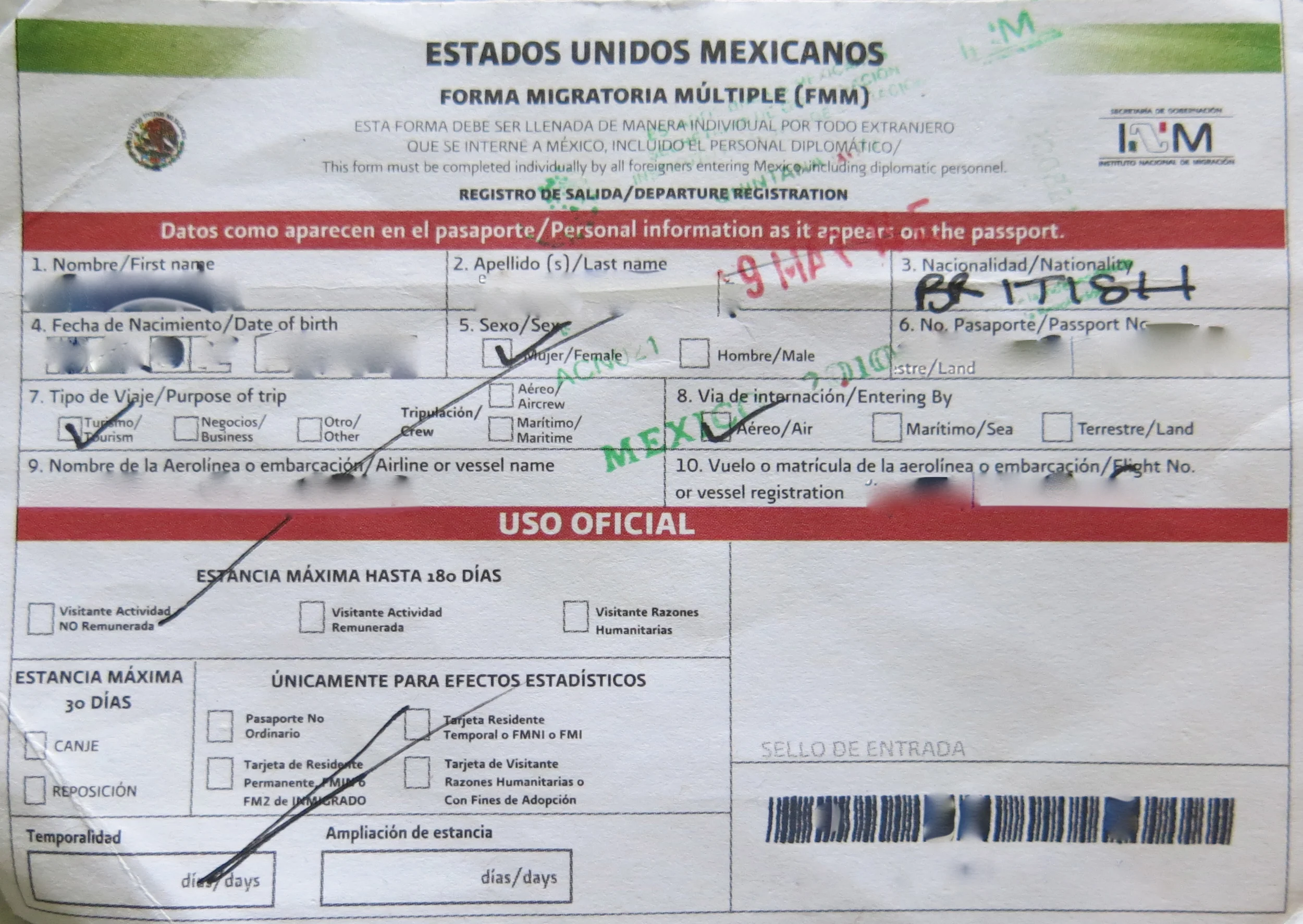 Whether you fly into Mexico or cross by land you will fill in this slip; be sure to keep it safe as you need it to exit. Some airlines will include the cost of this ticket in your airfare, but cheaper package companies are likely to put the cost on you to ensure advertised prices are as artificially low as possible (here's looking at you Thomas Cook and Thomson).