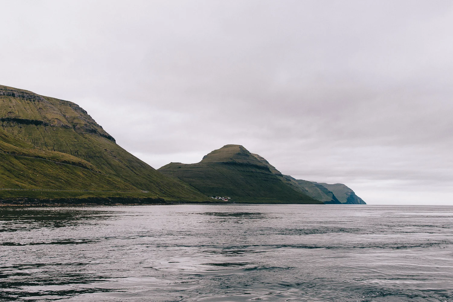 From here, it’s a lovely 16 kms drive (20 minutes) along a single narrow winding road which presents the Faroes road trip experience in microcosm; a smattering of picturesque villages, views over the rolling hills and inky waters, sheep stops, and terrifying tunnels.